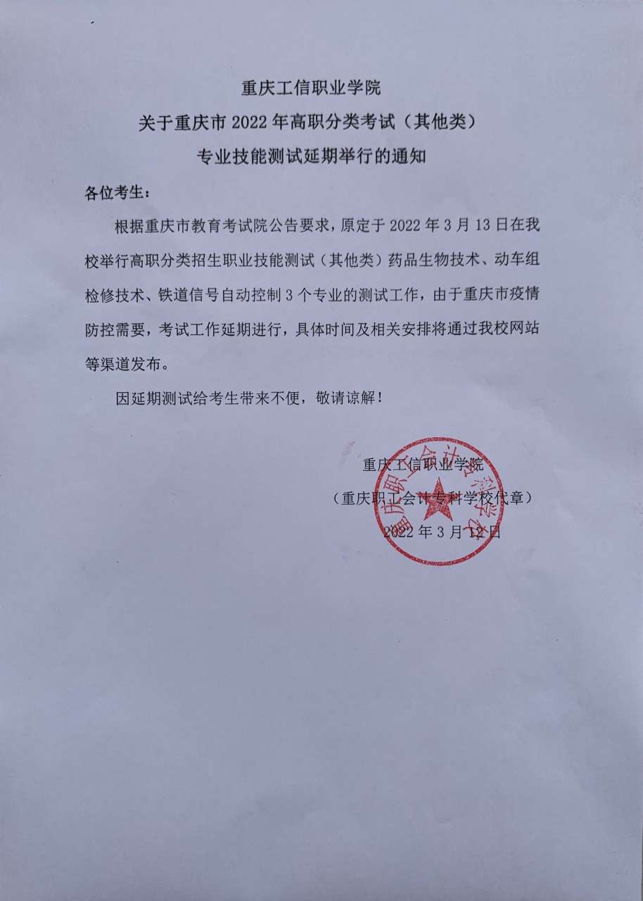 华体会平台app关于重庆市2022年高职分类考试考试(其他类)专业技能测试延期举行的通知